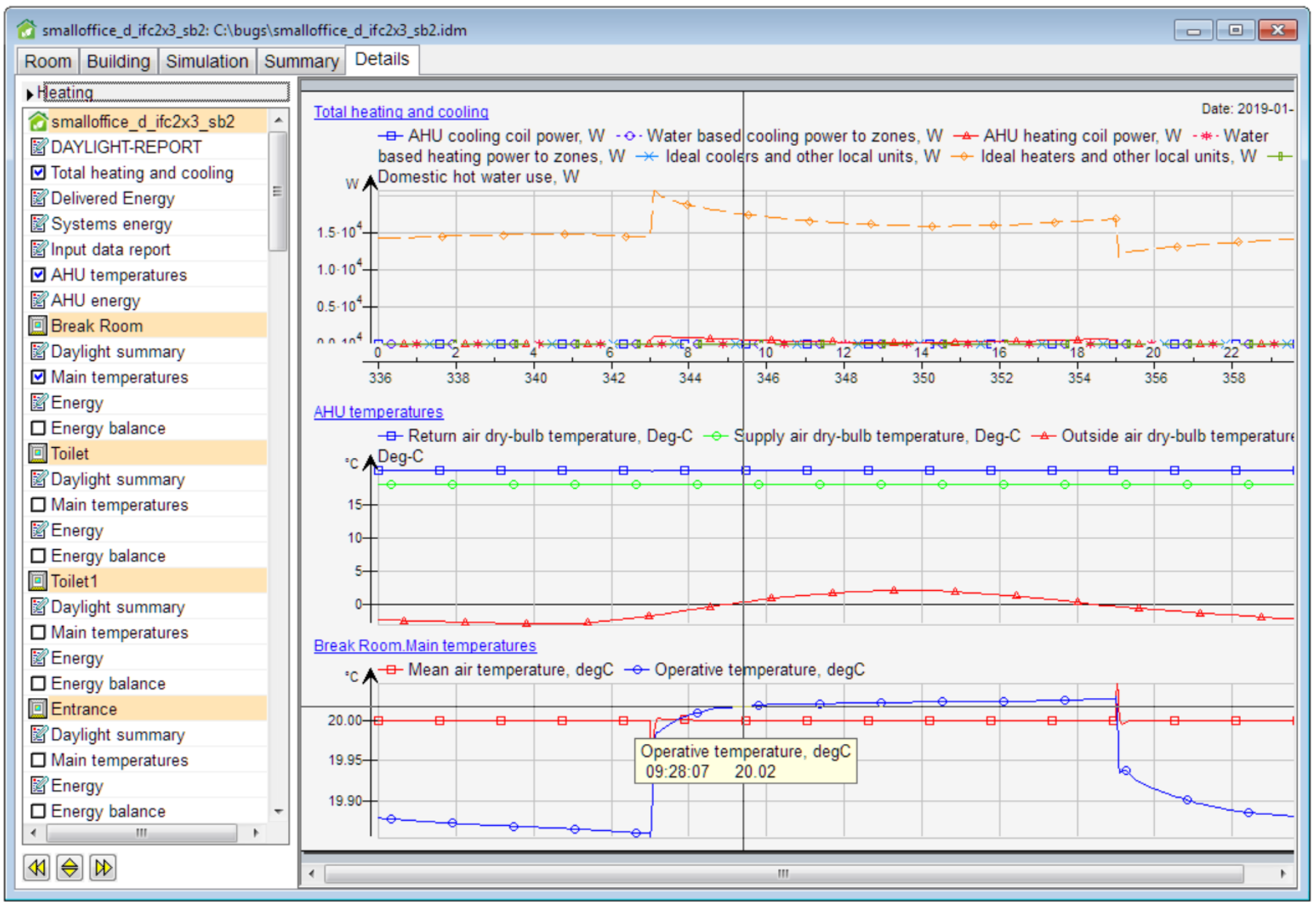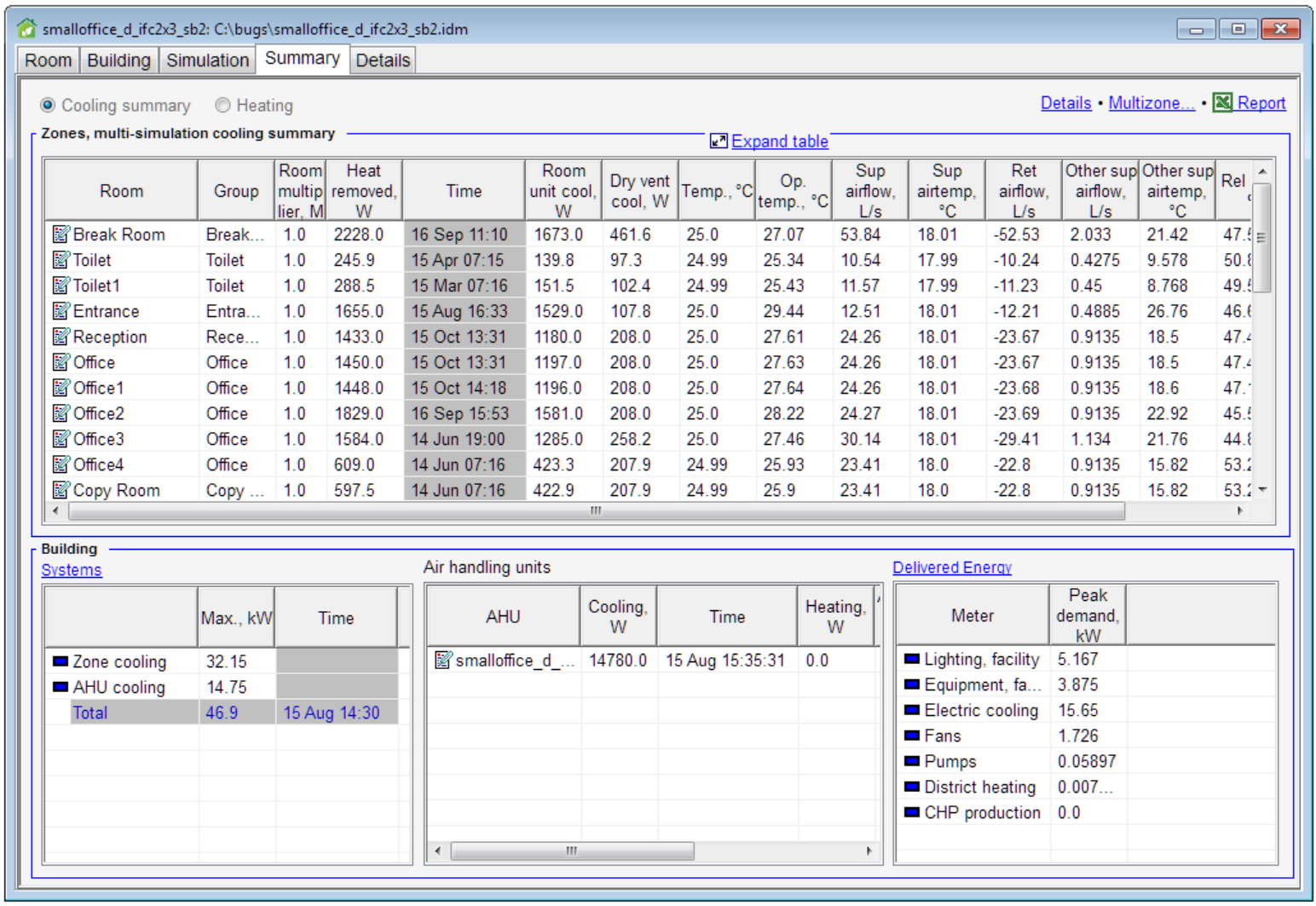 Results of multiple simulations are now saved with the project file, and a new report for each simulation type has been added. In the paid version of ESBO two new result tabs can be opened; Summary and Details. The Summary tab includes summary tables for the rooms, air handling units and the building. For cooling load calculations, a summary of individual peak cases is presented. The Details tab features new ways of presenting multiple diagrams together, and it uses snapping crosshairs for easy reading.