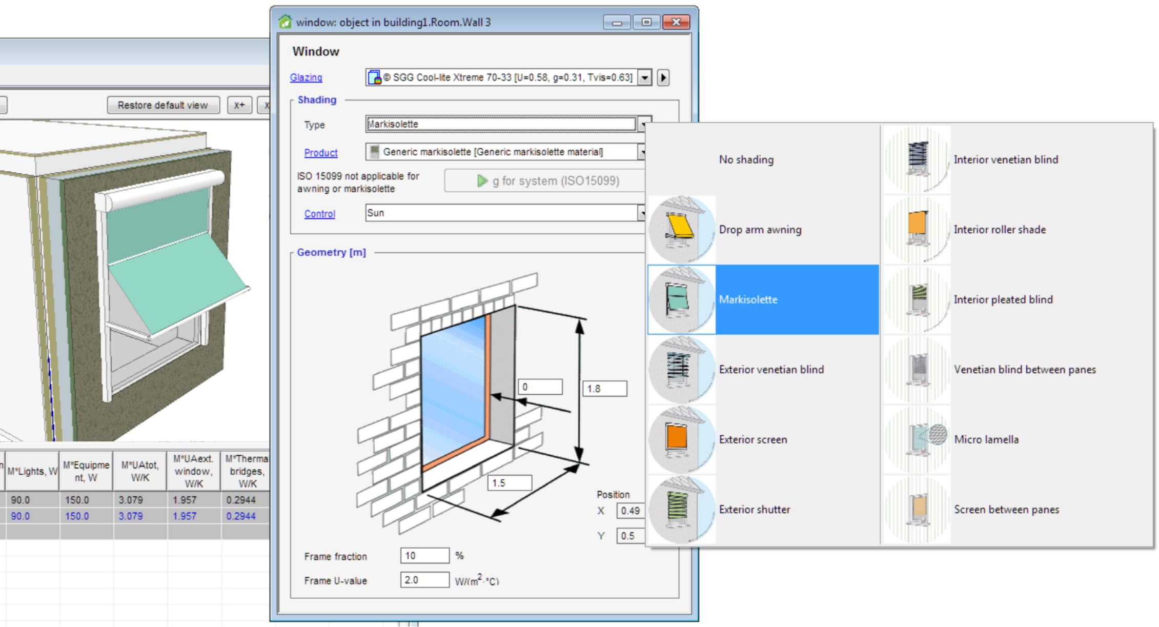 Three new types of typical shading devices can now easily be selected for the window; Micro lamellas (shading dependent on two angles), Venetian blinds between panes and Screens between panes. Access to manufacturer data for shading materials has been enabled.